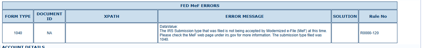 The IRS has informed us that they have temporarily stopped HUB transmissions today to address an internal programming issue. As a result, the rejection noted below may impact returns that were transmitted earlier this morning. At this time, there is no estimated timeframe for when transmissions will resume, or if they will resume today.